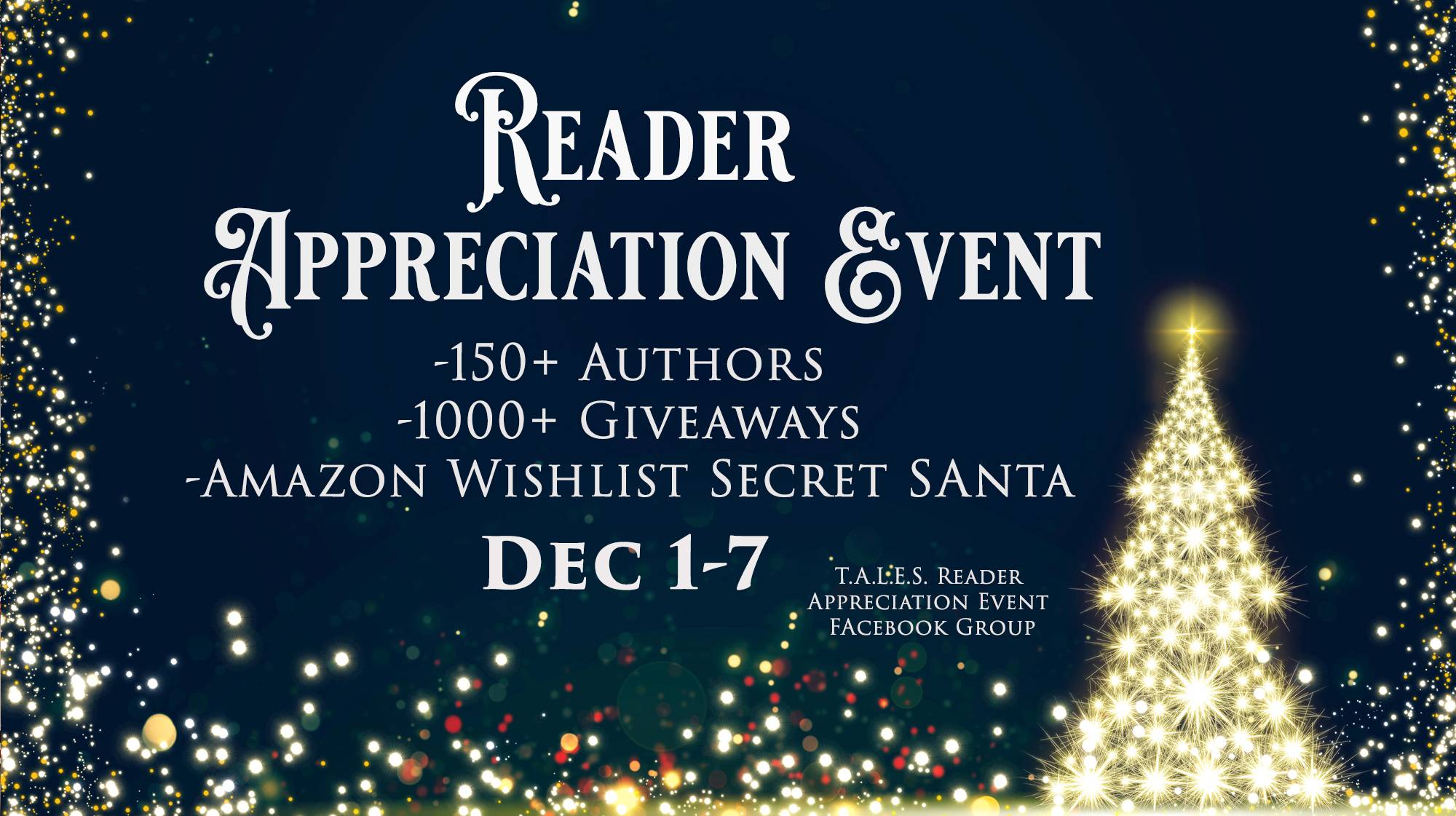 TALES Reader Appreciation party is now LIVE. The first events have started. I love this event as an author and even more as a reader. I have already added my two cents to secret santa events and giveaways. It is the best reader celebration of the year. You need to check it out. I will have a very special giveaway and lots of fun games for the event. My time is on Dec. 2nd (tomorrow) at 2:00 pm.